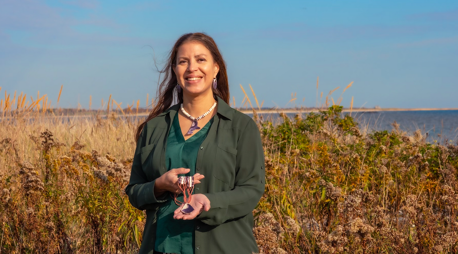 Award-winning Native artist Elizabeth James-Perry creates rich purple wampum jewelry, textiles and maritime arts directly tied to her Aquinnah Wampanoag tribal heritage.