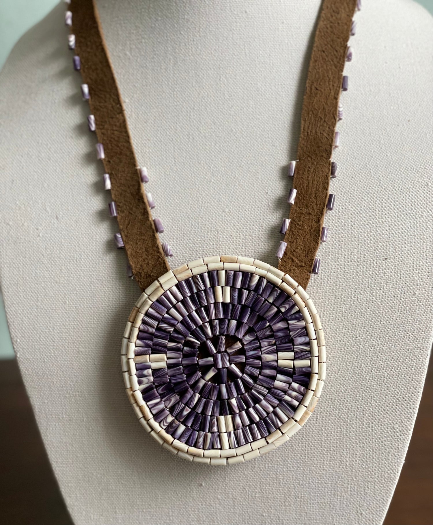 Permanent collection: a Corn effigy old-style large wampum belt on hand-dyed milkweed and a large wampum leadership medallion on walnut dyed deerskin.