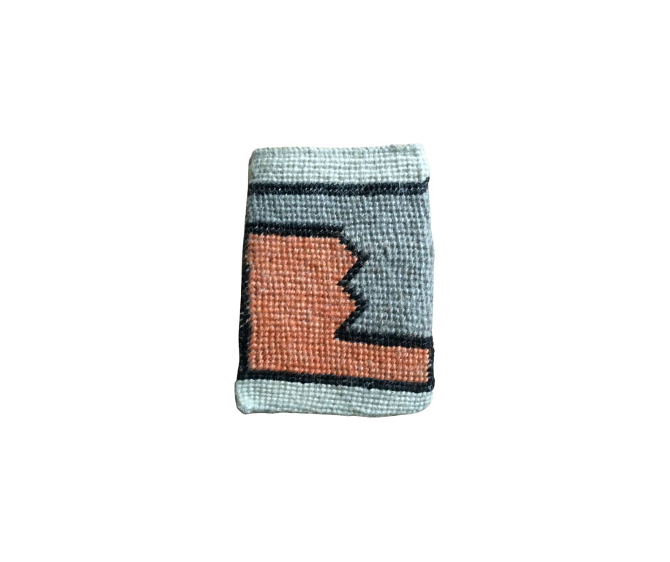 Permanent collection: Birds Wing (shown right) patterned twined envelope bag, contemporary design in organic hand-spun hemp, natural permanent dyes; Square Leadership Medallion wampum on deerskin.