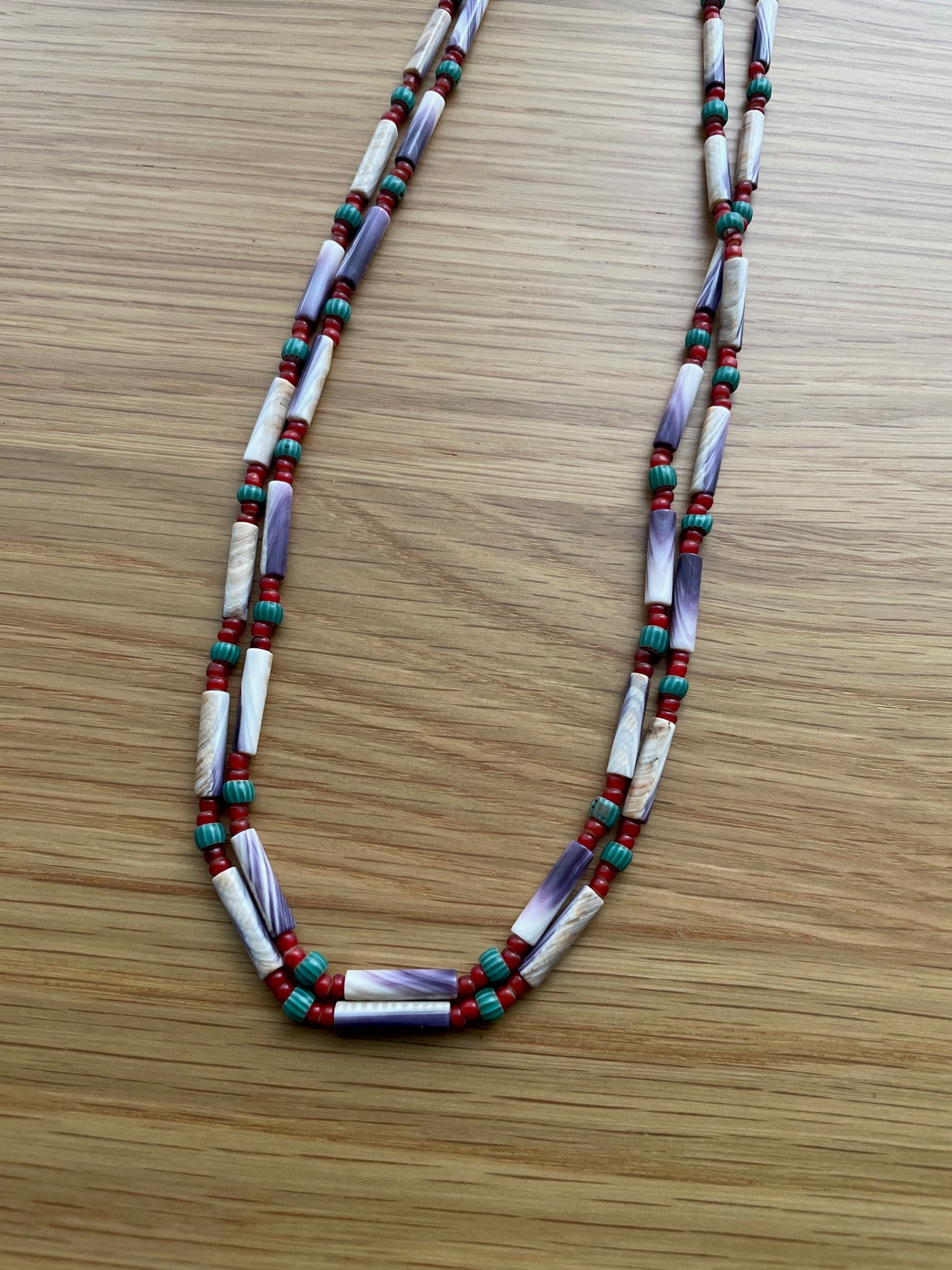 A double strand of light purple wampum interspersed with antique green chevron beads and red white heart glass beads with a copper toggle clasp. 22” in length.