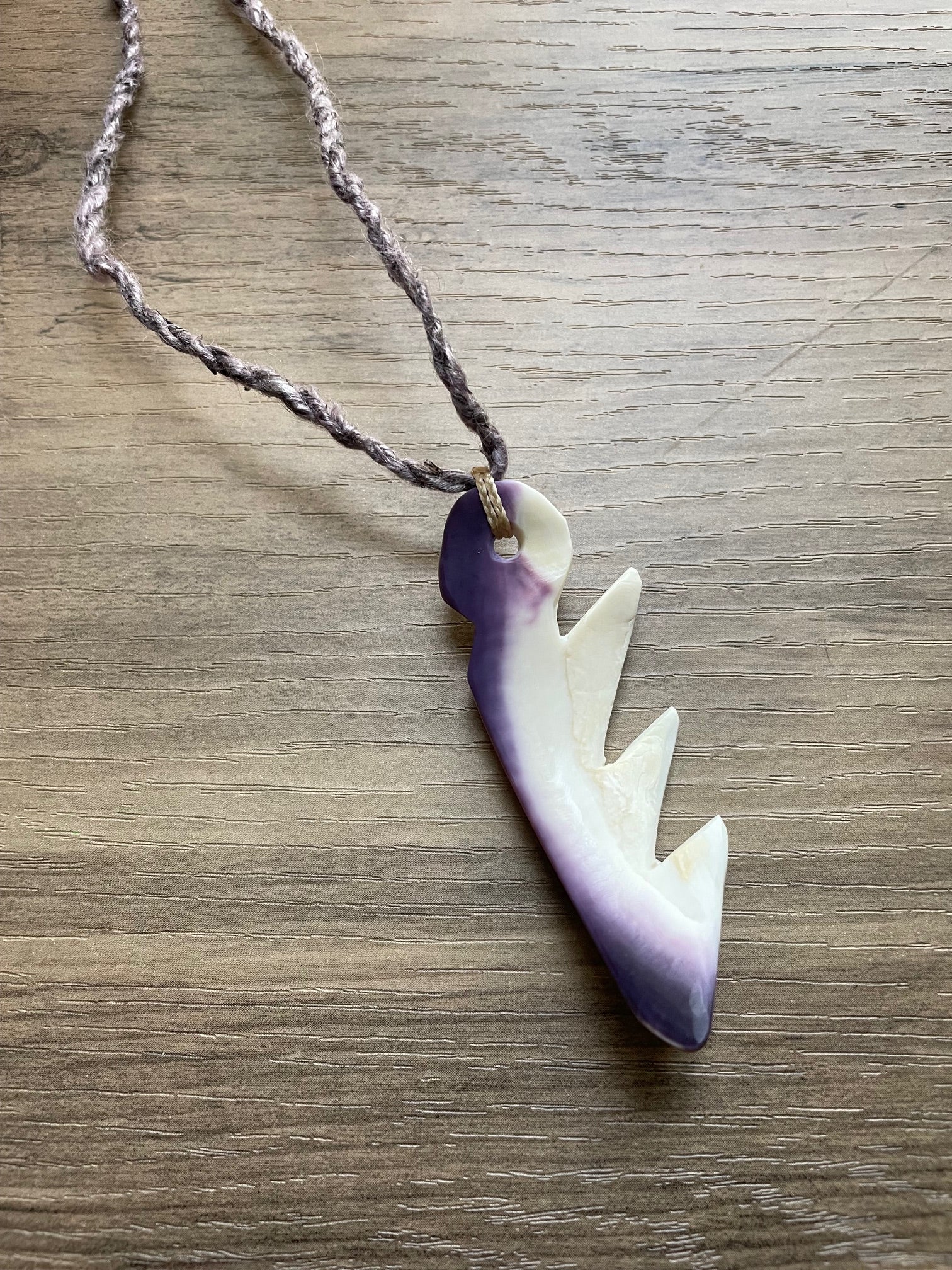 Nice contrast on this large hand carved wampum harpoon pendant, strung on hand-spun milkweed dyed pale purple. 3” long, on 25” necklace.