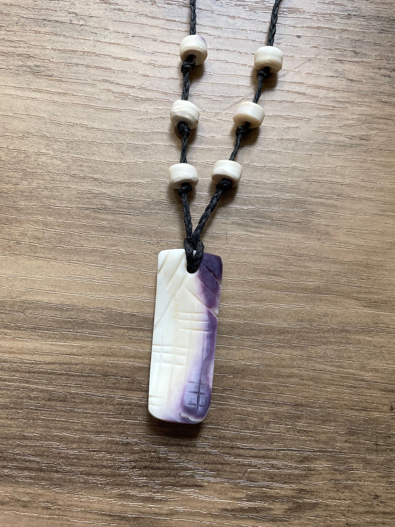 Kernels have been lightly carved in on this ear of corn, strung on black linen braid with 6 handmade wampum beads. 2” long pendant on 24” necklace with wampum toggle clasp.